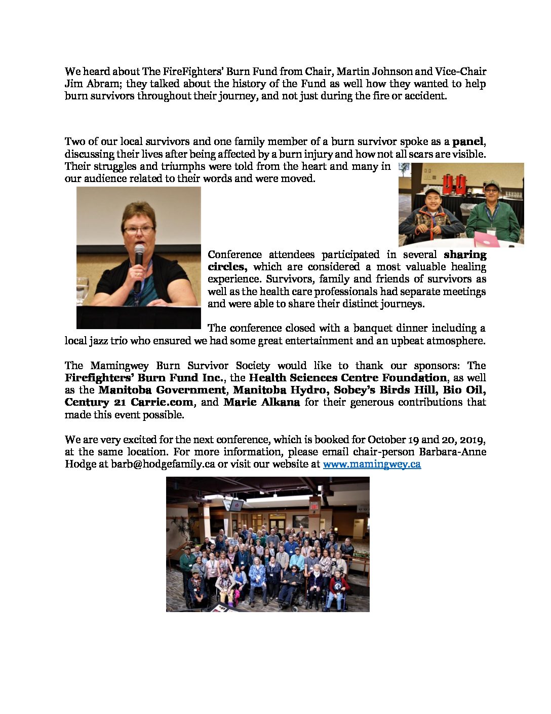 The 2018 Mamingwey Burn Survivor Conference will be held at the Canad Inns Polo Park Hotel at 1405 St. Mathews Ave. Winnipeg Mb on October 19 & 20, 2018. They Keynote speaker this year is Kelly Falardeau. The theme of this years conference is “Not all Scares are Visible.”